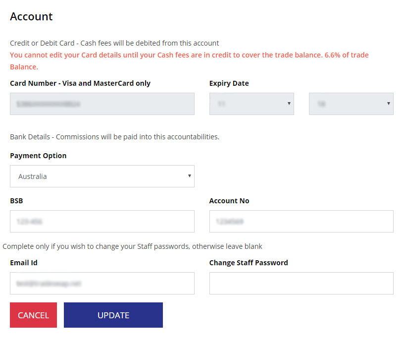 - This is also the place to change your STAFF PASSWORDS. This would be used if you have staff processing sales for your business. An example would be restaurants where staff need to process sales. A staff account can be set up using the main account email but the staff member has a different login.