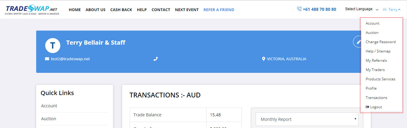 - Where you can edit your profile details except for your email address. This is also where you can give staff access to edit your auction and product and service listings.