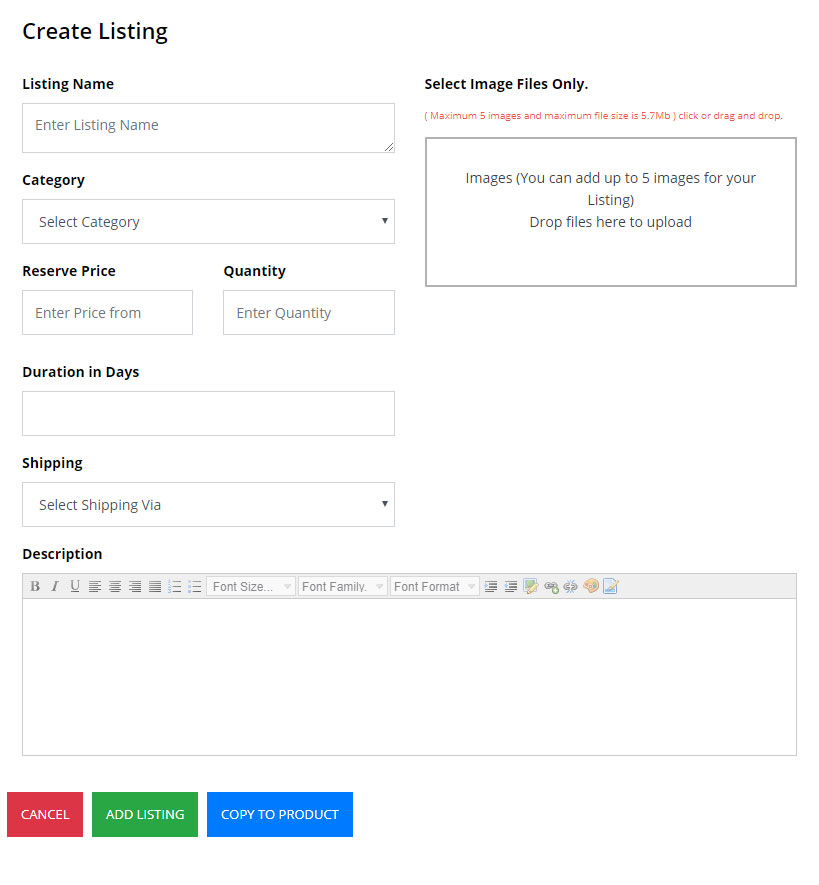 - Enter information in all the fields listed and then upload up to 5 photo's using IMAGE FILES ONLY. Click add listing and your product will be live on the auction site. If you would like to add this product to the website, click COPY TO PRODUCT and this will be done instantly.